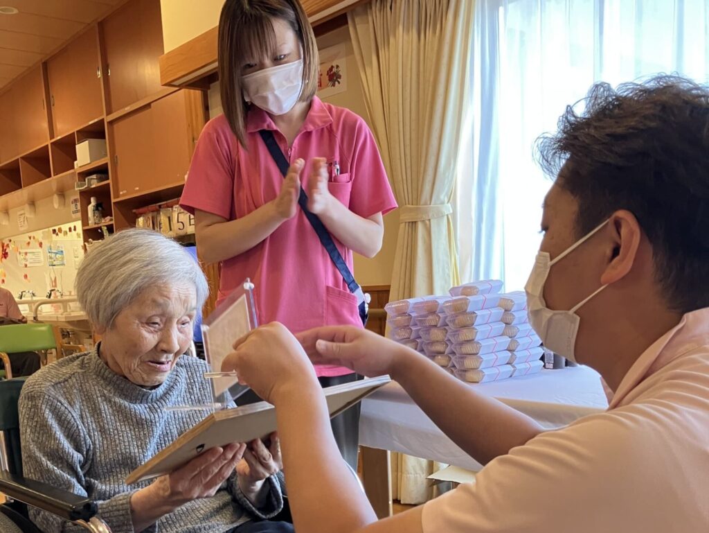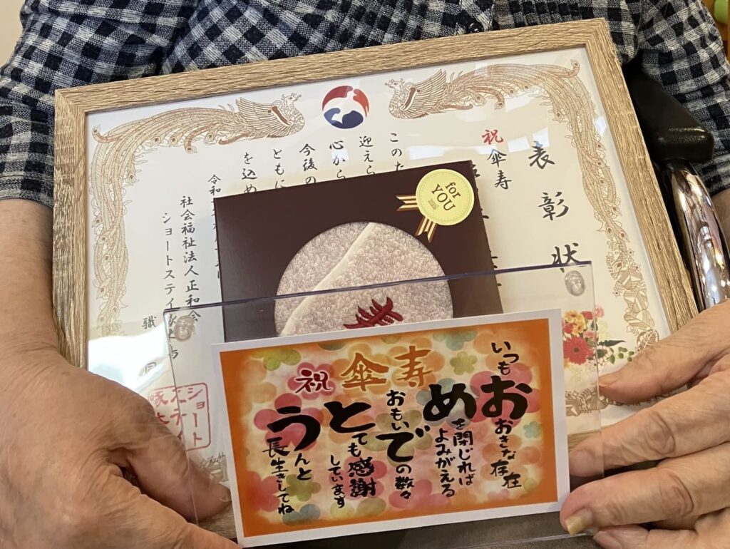 午後からは啄木鳥ホールにて敬老会が開催されました。年祝いを迎えられた9名の利用者様には表彰状、メッセージカード、「寿」の刺繍が入ったハンカチが贈呈され、それ以外の皆様にも紅白まんじゅうや水ようかんがプレゼントされました。