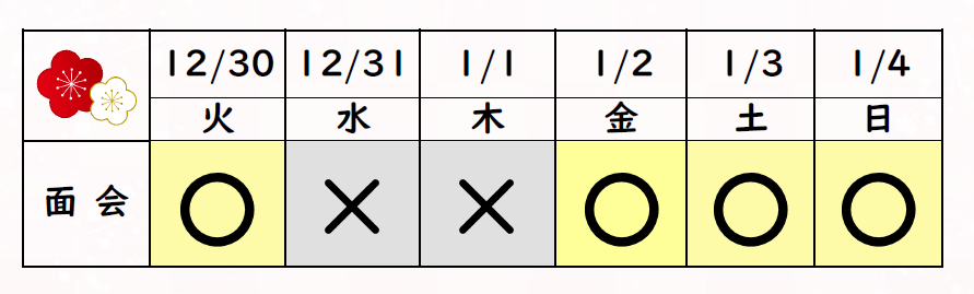 面会の予約受付は、年内は12月30日まで、年明けは1月2日からになります。