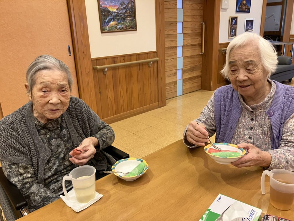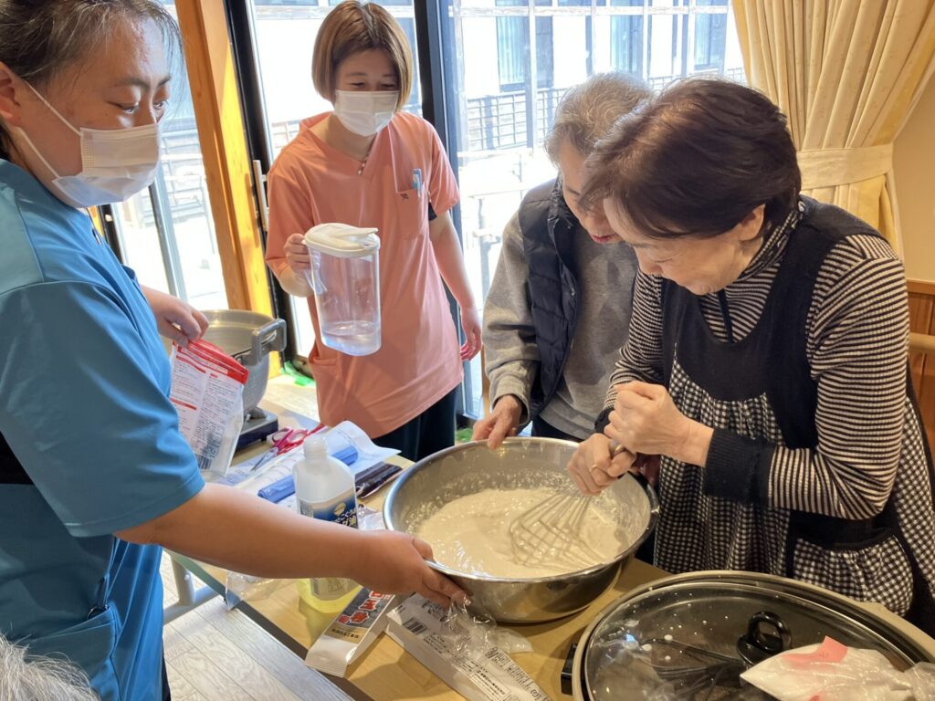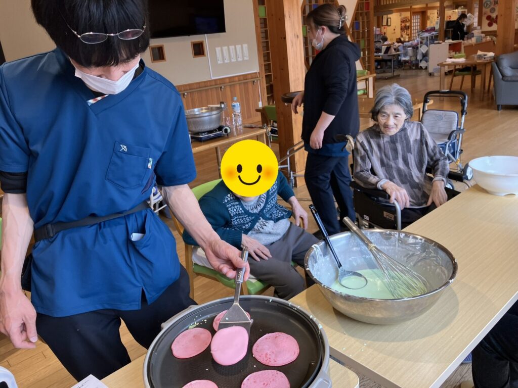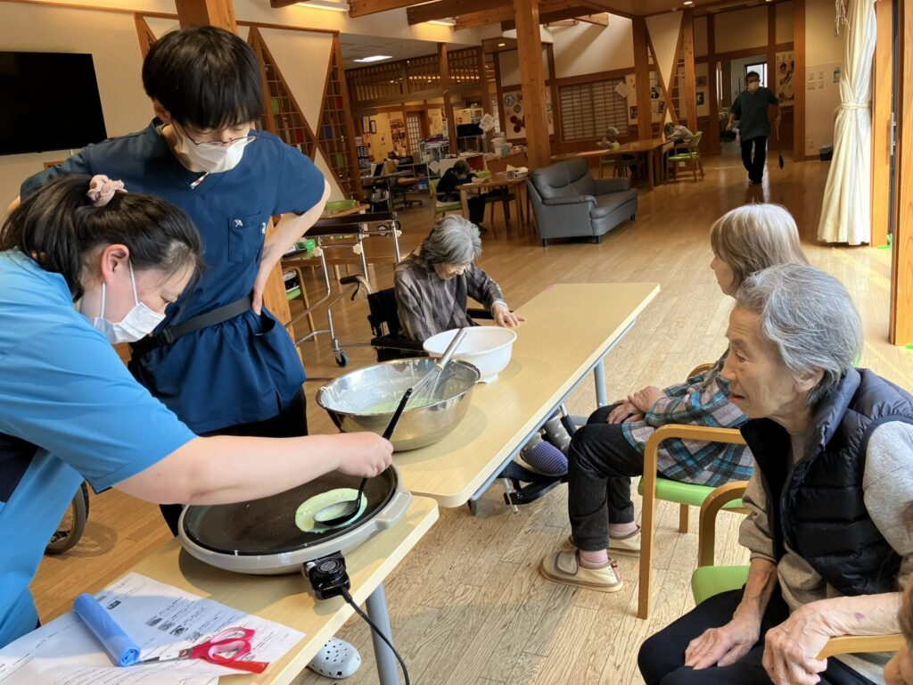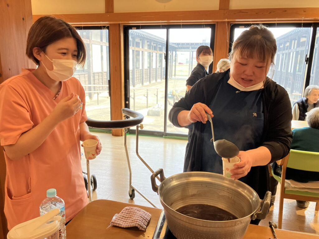 当日は利用者様にご協力いただきながら、生地を焼いたり、あんこを包んだりと作業を進めました。桜餅が食べられない方にはお汁粉もご用意し、ホール内には甘くていい香りが広がりました。初めはお菓子作りに慣れていない職員があたふたと動き回る場面もありましたが、回を重ねるごとに手際も良くなり、最後には職人顔負けの出来栄えに。利用者様からもお墨付きをいただくことができました。