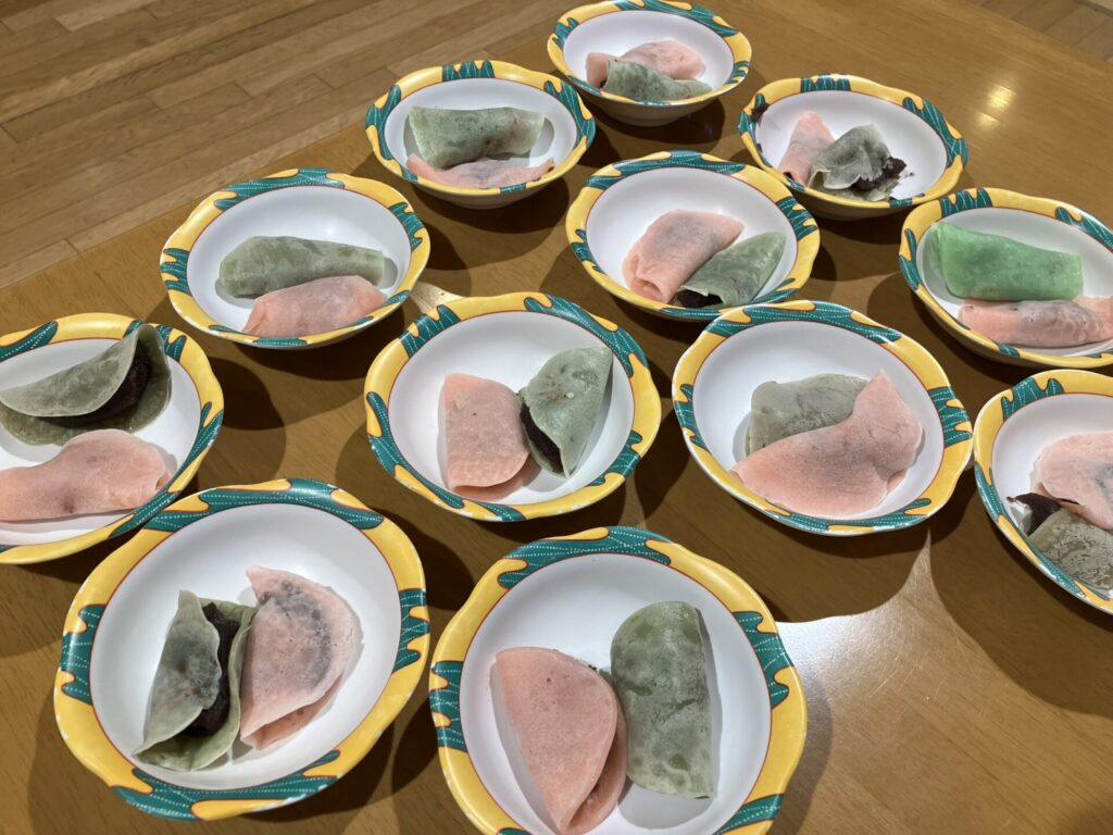 白玉粉を加えた生地はもっちりとした食感に仕上がり、甘いあんことの相性も良く、皆様からもご好評をいただきました。ピンクと緑の2色の桜餅は見た目にも華やかで春らしく、皆様からも満開の笑顔が見られました。
