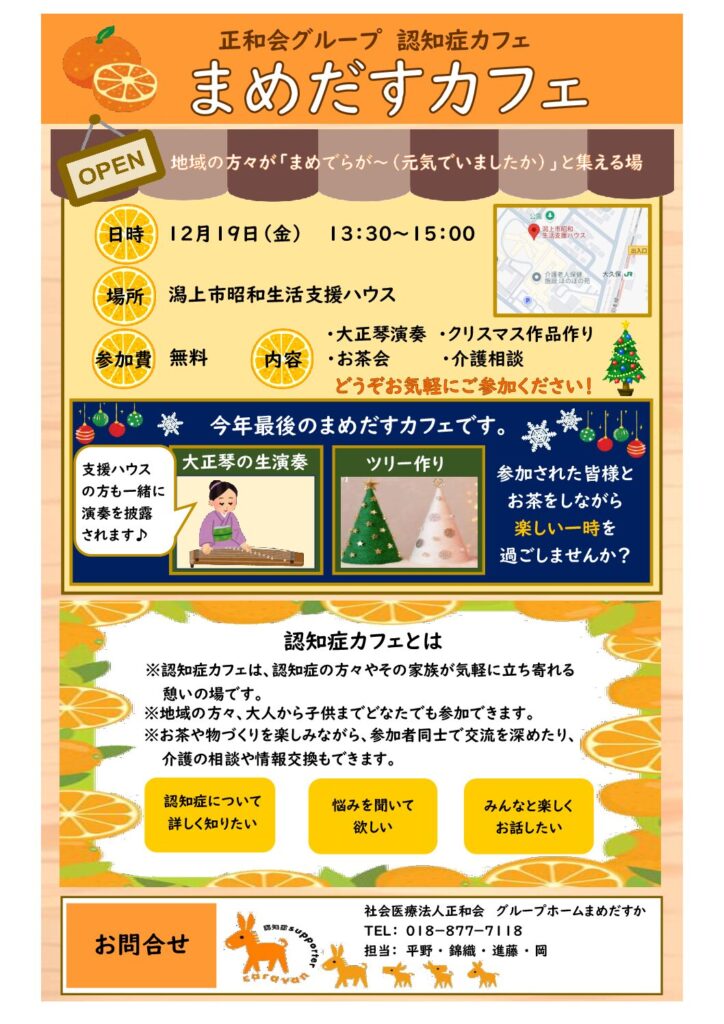 内容:お茶会・クリスマス作品作り・大正琴演奏(14時開演)・介護相談